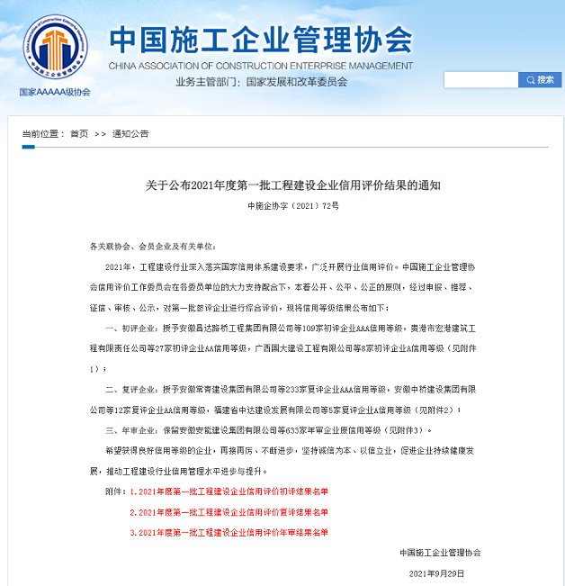 近日,在中國施工企業(yè)管理協(xié)會召開的2021年度工程建設誠信企業(yè)推介大會上,公司再次獲得 “2021年度工程建設AAA信用等級企業(yè)”和“2021年工程信用7星級企業(yè)”等共二項榮譽,這也是“十四五”開局之年公司全面貫徹新發(fā)展理念、構建信用新發(fā)展格局在行業(yè)信用體系建設方面取得的突出成效。2021年,公司不斷完善信用體系,強化信用導向,企業(yè)管理水平和社會信譽度不斷提升。今后公司將以此為契機,不斷總結經(jīng)驗,補齊發(fā)展短板,助力企業(yè)高質(zhì)量發(fā)展。