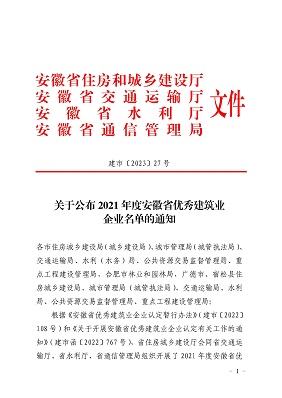 根據(jù)《安徽省優(yōu)秀建筑業(yè)企業(yè)認(rèn)定暫行辦法》和《關(guān)于開展安徽省優(yōu)秀建筑業(yè)企業(yè)認(rèn)定有關(guān)工作的通知》。省住房城鄉(xiāng)建設(shè)廳會(huì)同省交通運(yùn)輸廳、省水利廳、省通信管理局組織開展了2021年度安徽省優(yōu)秀建筑企業(yè)認(rèn)定工作。