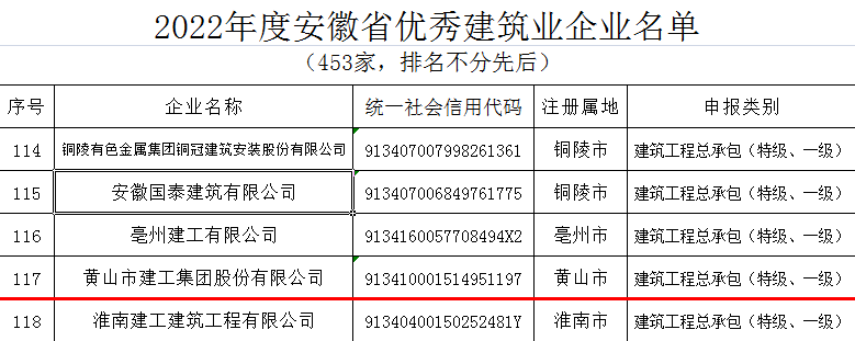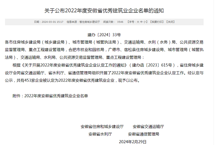 近日,安徽省住房和城鄉(xiāng)建設(shè)廳發(fā)布了“2022年度安徽省優(yōu)秀建筑業(yè)企業(yè)”名單,黃山建工集團憑借企業(yè)經(jīng)營發(fā)展、管理創(chuàng)新能力、企業(yè)建造能力、企業(yè)文化建設(shè)、社會責任履行等方面的卓越表現(xiàn)再次名列榜單――建筑工程總承包類(特級、一級類別)省優(yōu)秀建筑業(yè)企業(yè),連續(xù)多年斬獲該項殊榮。