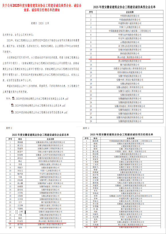 在安徽省建筑業(yè)協(xié)會同期開展的2025年度評選中,黃山市建工集團股份有限公司被授予 “2025年度安徽省工程建設(shè)誠信典型企業(yè)” 榮譽稱號。這是對我公司長期以來遵守市場秩序、嚴(yán)格合同履約、積極承擔(dān)社會責(zé)任等方面表現(xiàn)的褒獎。
