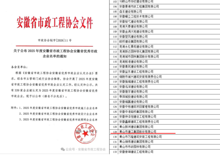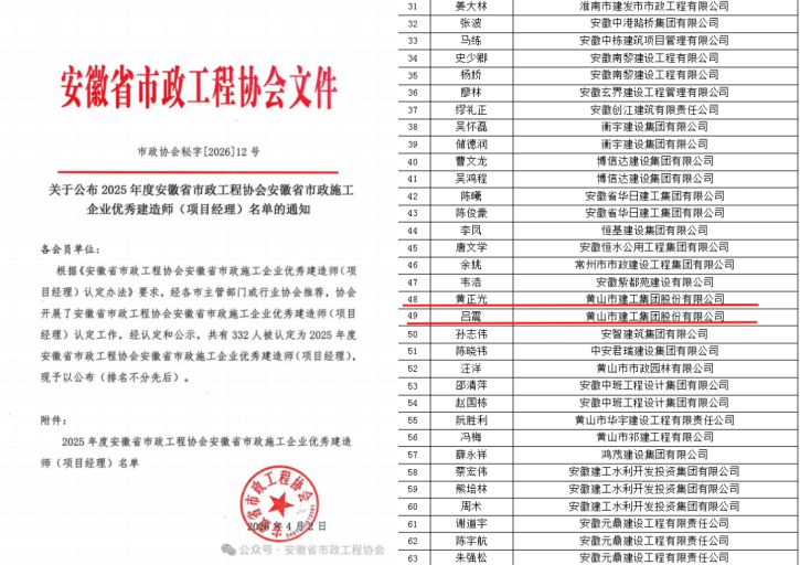 近日,安徽省市政工程協(xié)會(huì)發(fā)布了《關(guān)于公布2025年度安徽省市政工程協(xié)會(huì)安徽省優(yōu)秀市政施工企業(yè)名單的通知》及《關(guān)于公布2025年度安徽省市政工程協(xié)會(huì)安徽省市政施工企業(yè)優(yōu)秀建造師(項(xiàng)目經(jīng)理)名單的通知》。黃山市建工集團(tuán)股份有限公司憑借卓越的綜合實(shí)力與優(yōu)質(zhì)的工程業(yè)績(jī),連續(xù)多年榮登“2025年度安徽省優(yōu)秀市政施工企業(yè)”榜單。這也是繼集團(tuán)獲“2024年度安徽省優(yōu)秀建筑業(yè)企業(yè)”后,在工程建設(shè)領(lǐng)域收獲的又一重量級(jí)榮譽(yù)。 同時(shí),黃正光、呂震兩位同志憑借扎實(shí)的專(zhuān)業(yè)素養(yǎng)和出色的項(xiàng)目管理能力,雙雙榮獲“安徽省市政施工企業(yè)優(yōu)秀項(xiàng)目經(jīng)理”稱(chēng)號(hào)。