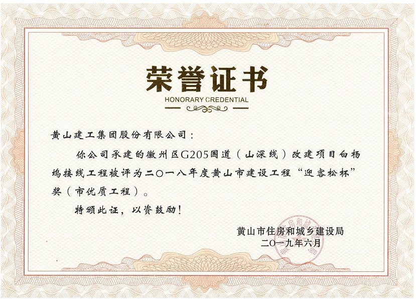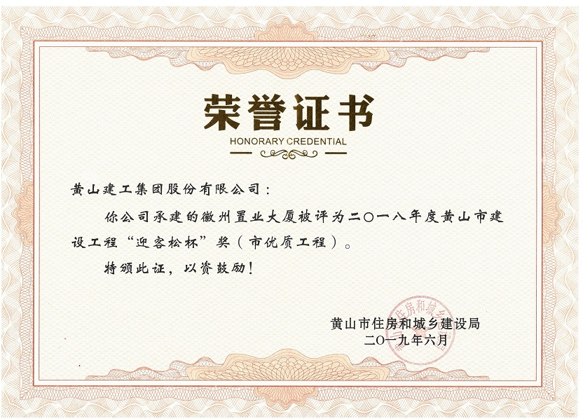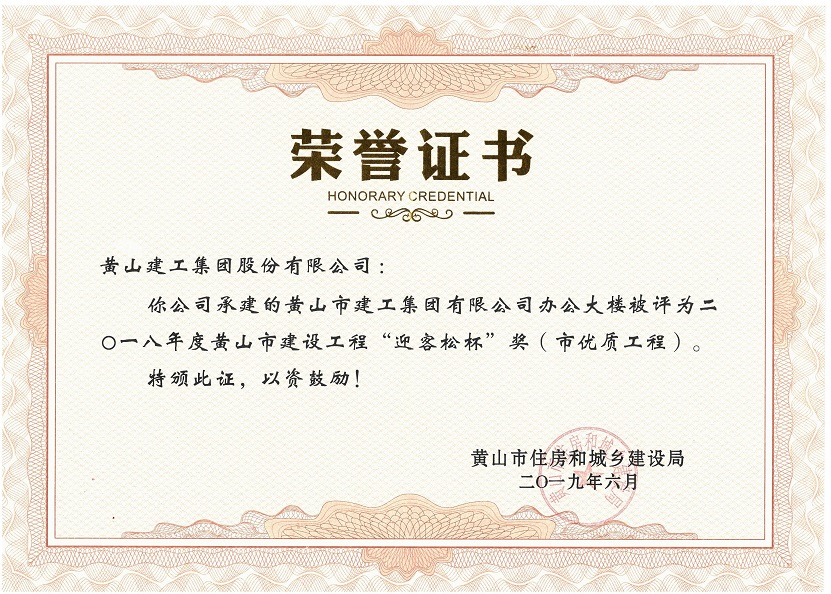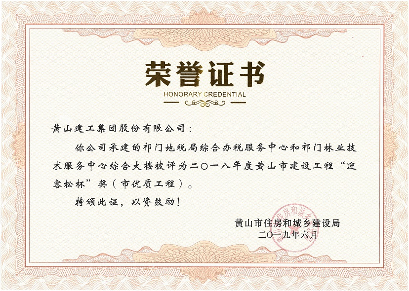 2019年度黃山市建設工程優(yōu)質(zhì)工程獎
