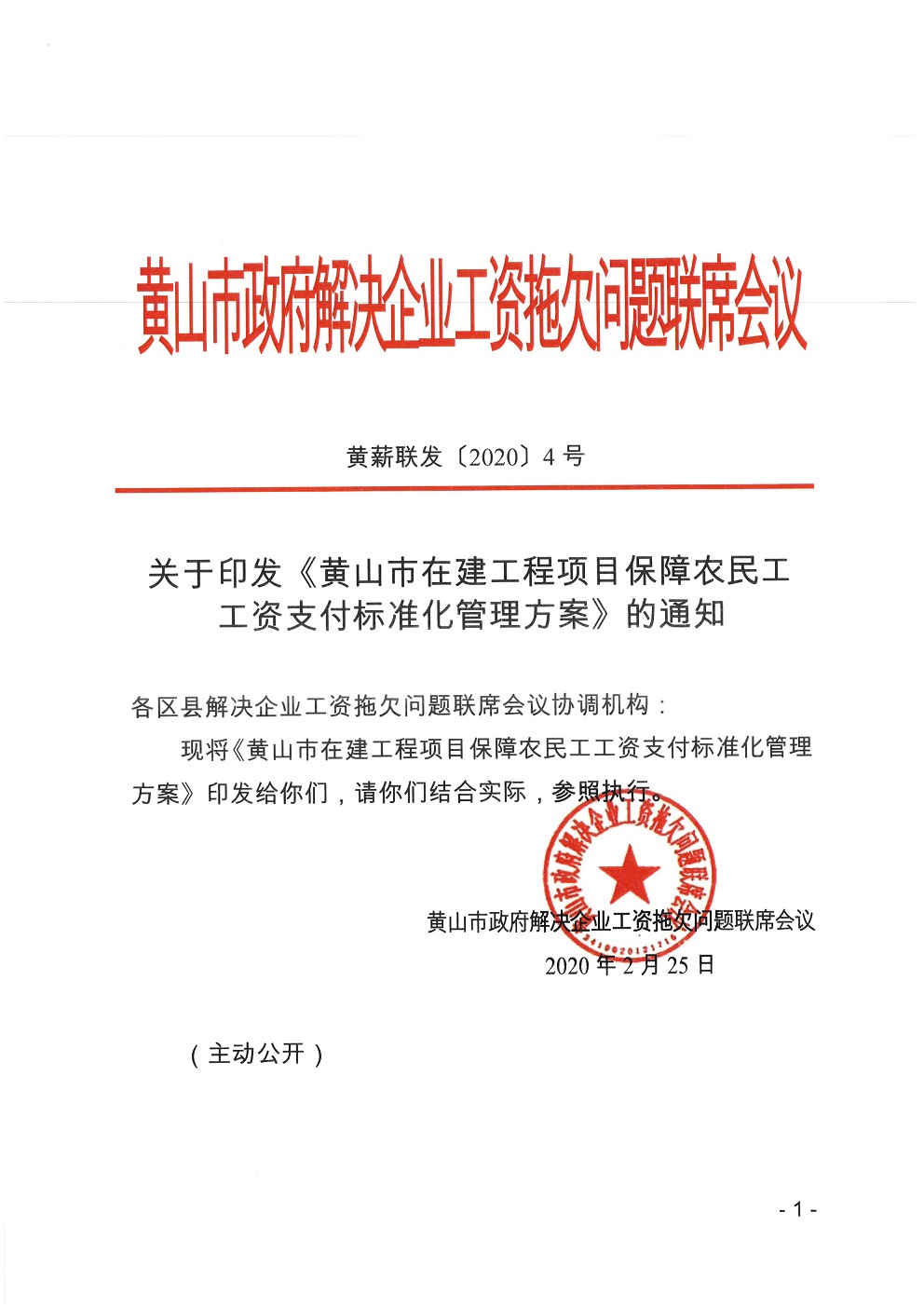 關(guān)于印發(fā)《黃山市在建工程項目保障農(nóng)民工工資支付標(biāo)準(zhǔn)化管理方案》的通知.doc